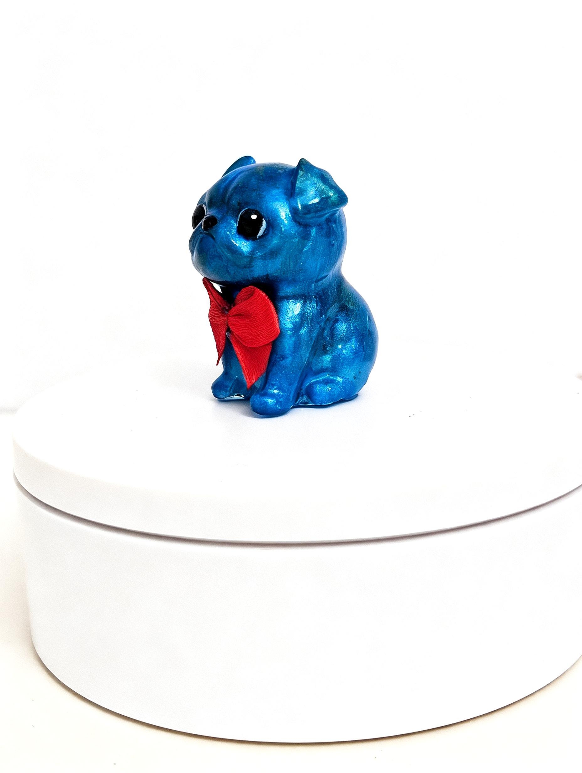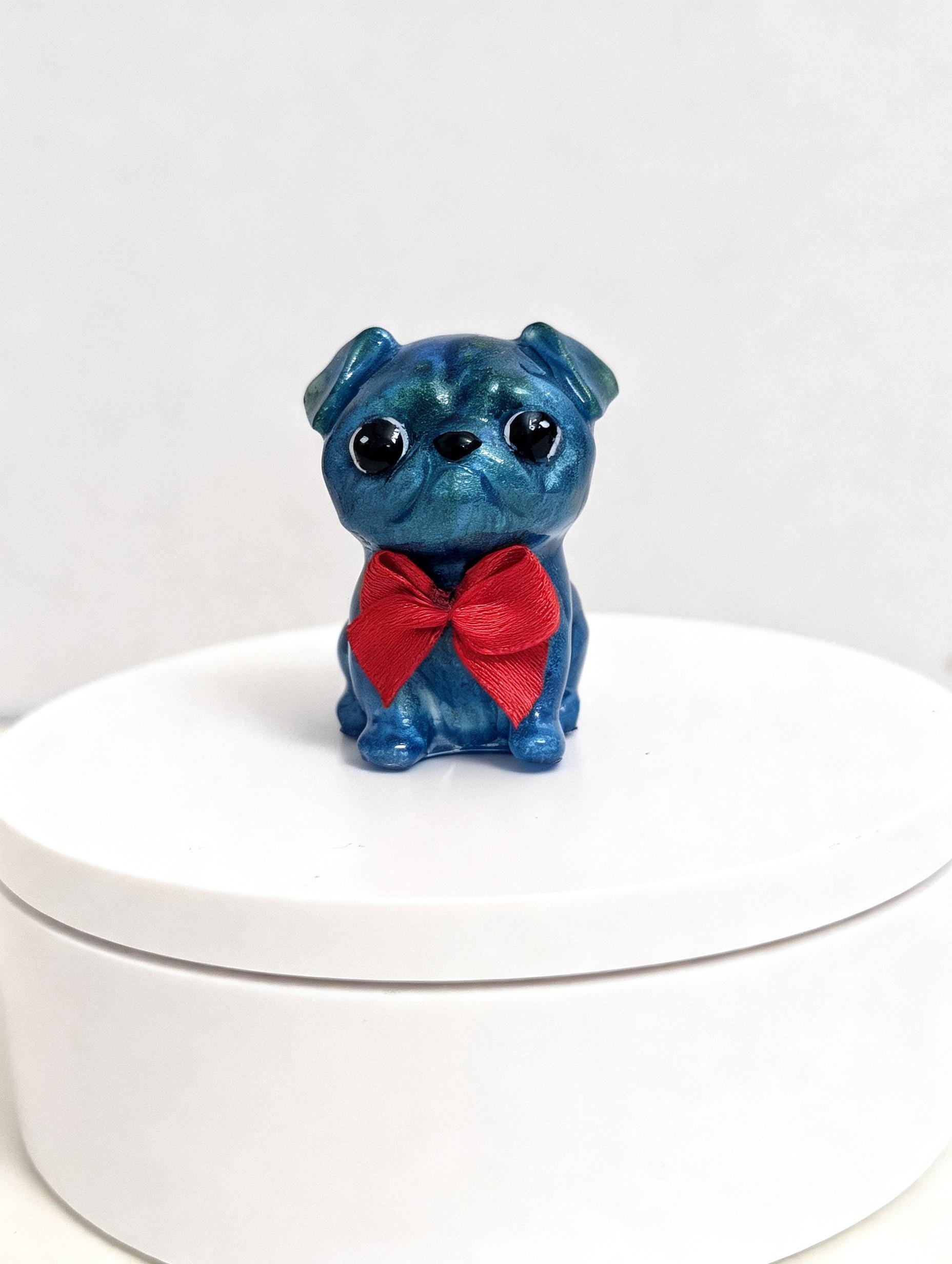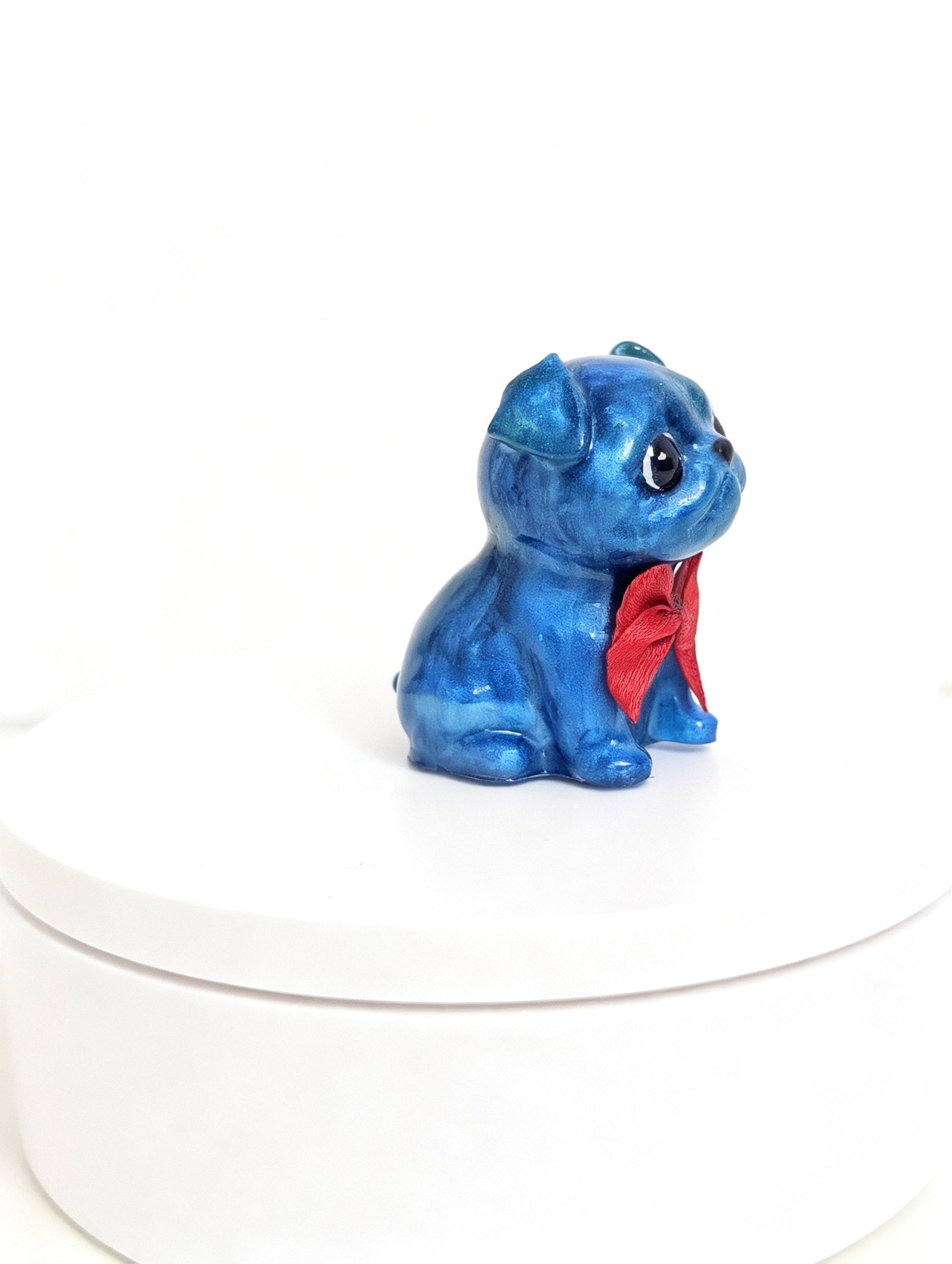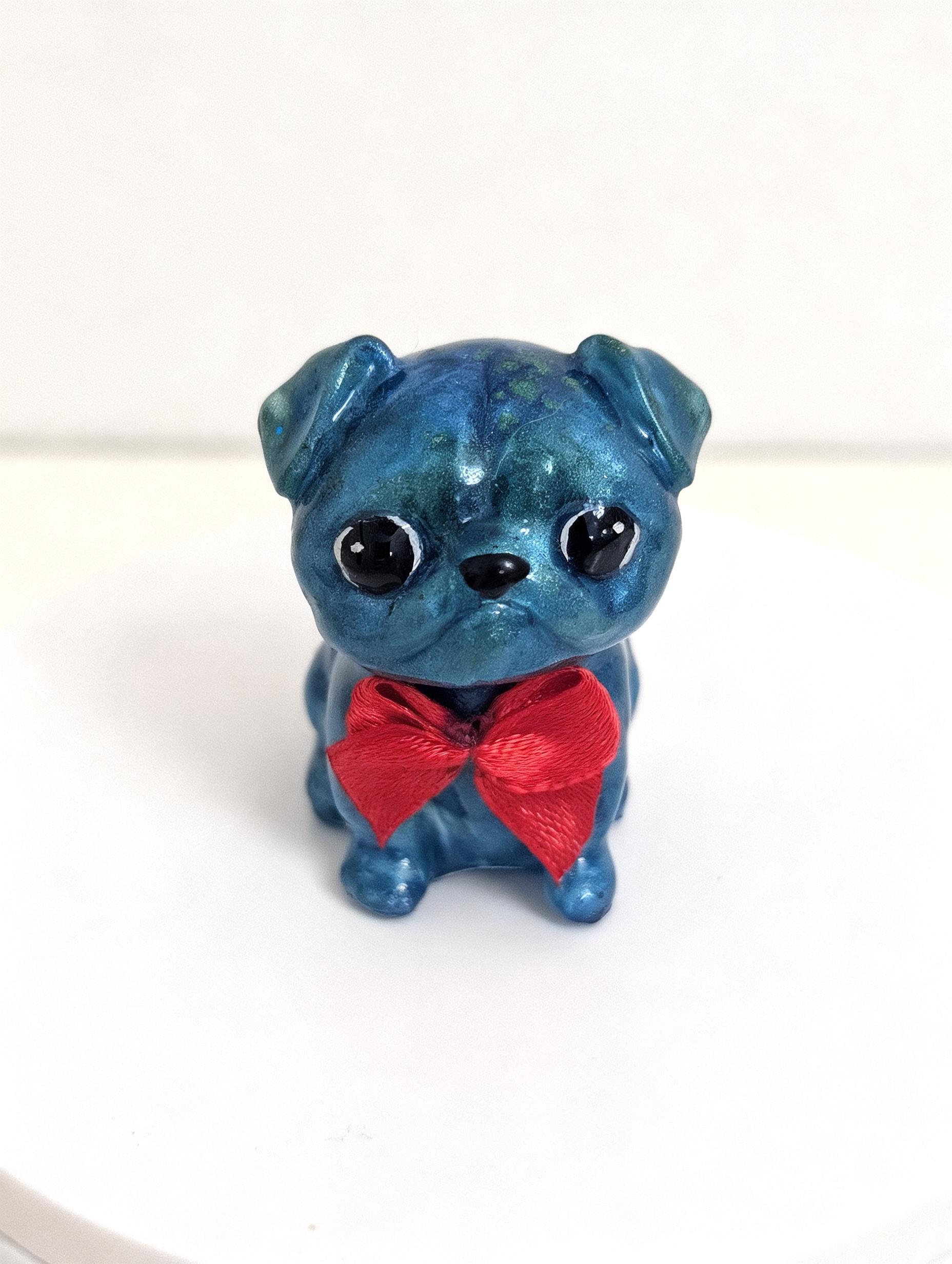 Here we have Pug Pup #2, Brought to you with a high gloss pearl blue/green galaxy finish accompanied with his little red bow.